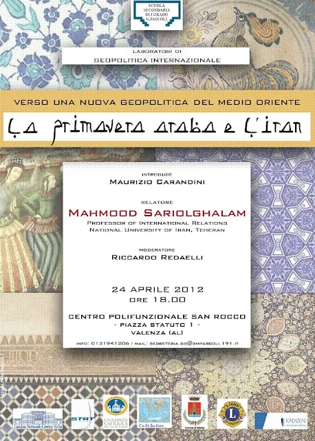 Il 24 aprile alle 18.00 a Valenza in Pzza Statuto n° 1 ci sarà l'incontro con il Prof. delle Relazioni Internazionali dell'Università di Theran per parlare della Primavera Araba e l'Iran.